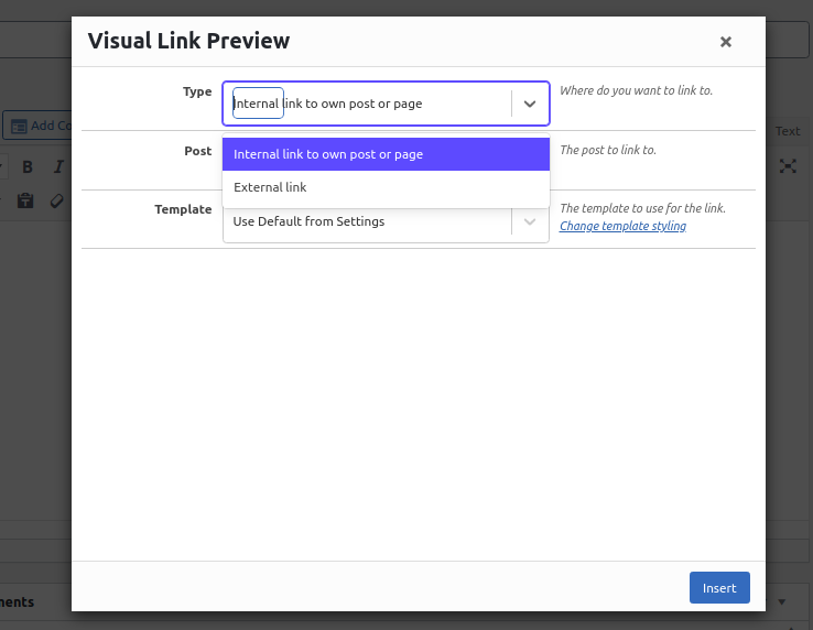 Since we are sharing an external link, click on the Type dropdown and select External.